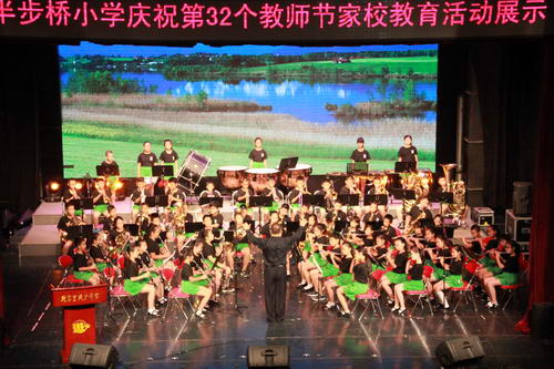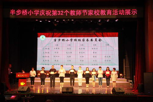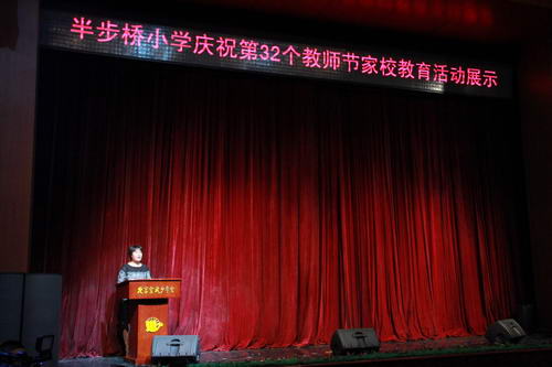 2016年9月9日下午14时,半步桥小学在宣武少年宫举办了以“理性智慧情怀”为主题的“庆祝第三十二个教师节――家校教育展示”活动。来自北京教育学院李雯教授、迟希新教授;北京教育学院宣武分院李玉春书记、王秀梅主任;西城教委小教科李靖科长、石虹科长,教育集团校相关领导;部分退休教师及各年级家长,与全体教师、部分学生一起参加了此次活动。