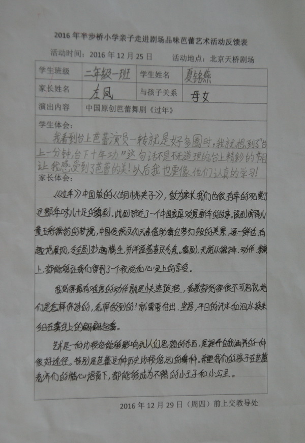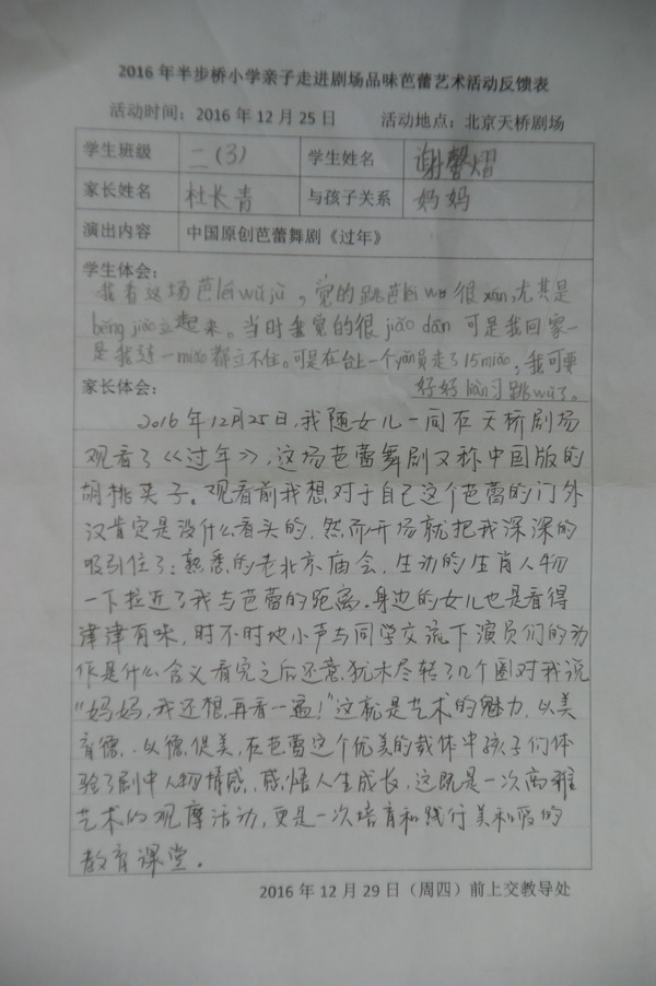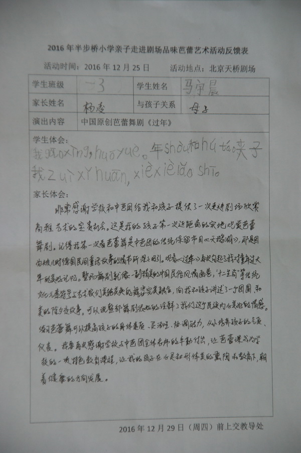 活动结束了,学生、家长纷纷表达了自己的感受。孩子们非常喜欢这样的学习,希望以后有更多的机会走进剧场观剧。对演员的精彩表演赞叹不已,要向他们学习,要认真上好每节芭蕾课。家长们非常感谢中央芭蕾舞团、学校开展这么好的活动,对芭蕾舞剧《过年》感觉震撼、中国传统文化表现得淋漓尽致,对艺术家们的专业素养和敬业精神敬佩不已,对他们为孩子们的努力付出表示感谢!学校通过组织这次活动,真正达到了“以美育德,以德促美”的教育效果。在芭蕾这个优美的载体中孩子们体验着剧中人物的情感,感悟人生的成长,这不仅仅是一次高雅的艺术体验活动,更是一堂培育美、践行美的生动教育课。